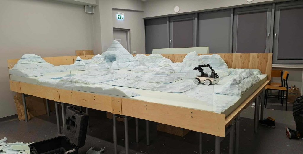 W wyniku wygranegoKonkursuDziałania D12 IDUB „Integracja procesu kształcenia z badaniami naukowymi” – Wsparcie Kół Naukowych” – edycja V 2024/25, JM Rektor AGH przyznał dofinansowanie w wysokości 45’000 zł na realizację prac badawczych pt. „Projekt i realizacja innowacyjnego stanowiska laboratoryjnego do symulacji autonomicznych robotów eksploracyjnych”. Rezultatem projektu jest stworzenie fizycznego środowiska do testów możliwości eksploracyjnych robota mobilnego działającego pod systemem ROS 2. Środowisko to, o wymiarach ok. 2,9 x 4,5 m, odpowiada hipotetycznemu krajobrazowi lodowych księżyców planet zewnętrznego Układu Słonecznego, które są celem planowanych misji robotycznych. Walidacja symulacji robota w środowisku fizycznym obejmowała m.in. przejazd przez przeszkody, symulację fizyczną wpływu nawierzchni na możliwości trakcyjne robota, zadania manipulacyjne oraz działania złożone, wykonywane w różnych częściach skonstruowanego przez nas środowiska. Poniżej przedstawiamy wizualizację stanowiska i jego faktyczną realizację wraz z testowanym robotem ROSbot XL. Fizyczne środowisko symulacyjne jest już wykorzystywane w badaniach Koła oraz Zespołu Badawczego Inteligentnych Autonomicznych Systemów Decyzyjnych. Zapraszamy do współpracy chętnych do realizacji w ramach Koła prac dyplomowych (kontakt z Opiekunem Koła).